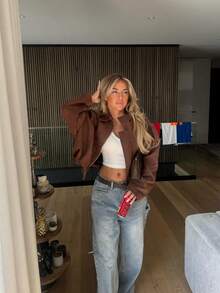 ELISA FRONT ZIPPER POCKET BROWN BOMBER JACKET - Leminque